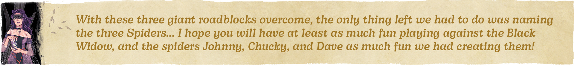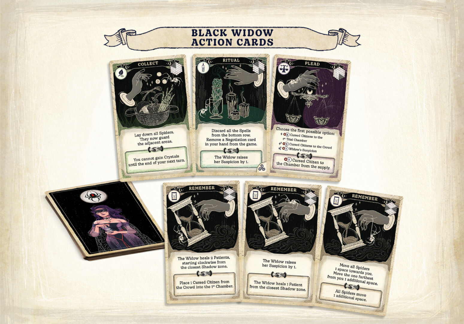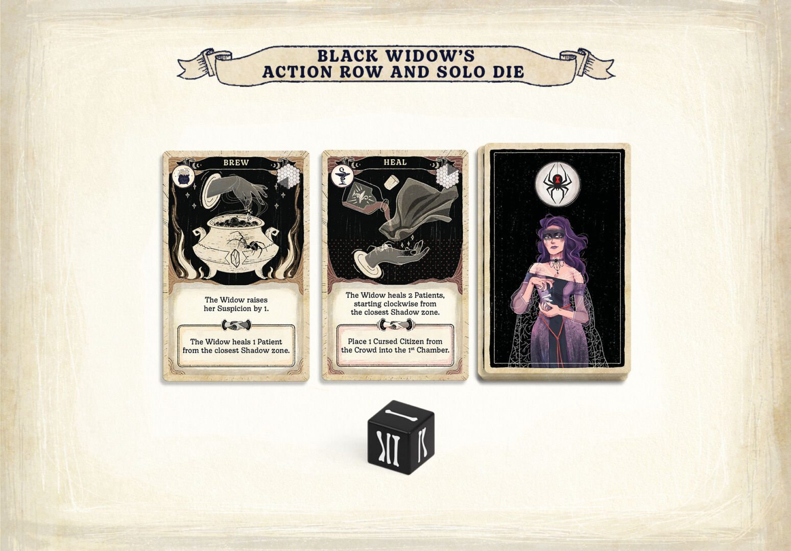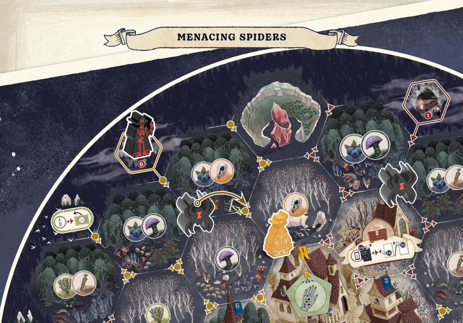 The trick was to figure out what the bot should do on the remaining actions. When I collect ingredients, it doesn’t directly affect you, so the bot couldn’t have either. We tried “bot loses you some wisdom” style roadblocks, but the in-game scoring opportunities in Septima are not that many, so it felt forced and occasionally too punishing. This is where the second question – theme – came to the rescue. Since “being in the wrong place” is an interaction, but just having one other piece on the board would not make enough difference to be worth it, we decided to have three pieces roam the board. In the first thematic attempt they were swamp zombies, but still, their effect was not relevant enough. When we introduced the effect that Collect “lays them down” blocking you from collecting adjacent to them, and that you would suffer penalties for even moving next to them, the swamp zombie theme didn’t make much sense anymore – so they became giant spiders, and the automa – the one controlling them – is Black Widow, the troublemaking, somewhat antisocial witch… Of course witch hunters cannot arrest spiders, and frankly the Widow doesn’t care how suspicious she is – so raising the automa’s suspicion became an interesting pressure point: it increases the number of Angry Citizens, but it doesn’t worry her much. This gave us the effects for the last missing actions (Chant, Brew), and we had a full deck for her.