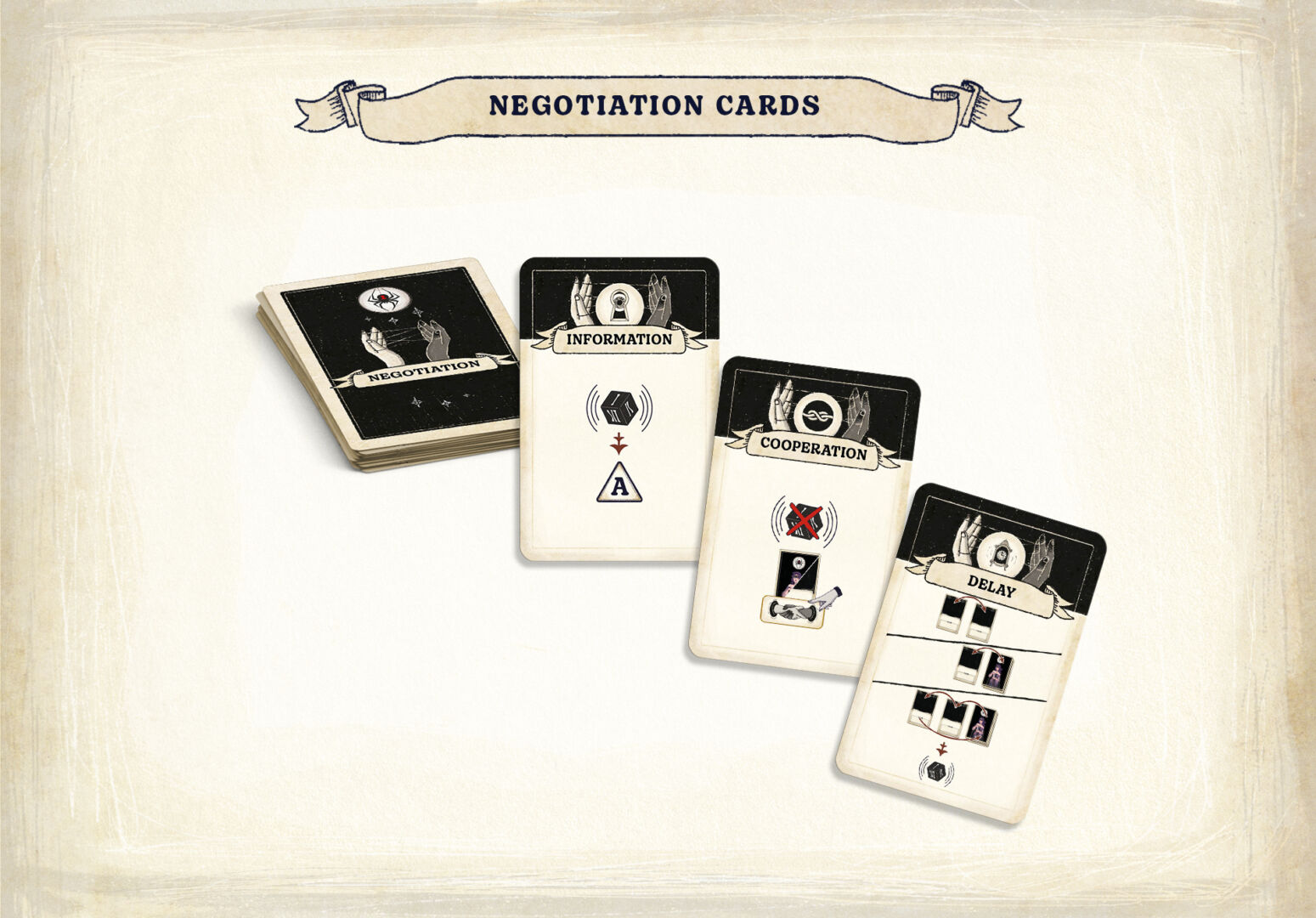 🕷️Issue 3: Something was missing, making everything ultimately meh. This is the absolute nightmare comment a designer can get from their developers. No one big issue exists, just nothing sings. We sat down all four of us – Robin, Viktor, John, and myself – to compare the things the multiplayer team liked in the game, to see if those were still in the solo game to be liked. We even tried designing new mechanisms for the game to “enrich” ( = complicate) the system. They spent many days trying out our new ideas in multiplayer, and while it did inspire a few improvements, ultimately, they were all judged unnecessary. So I went back to the core of the game, the action selection and the matching. Obviously, it sounded more exciting with 3 players than in solo, but why did it work with 2 players and not in 1? Watching Robin and Viktor play, it dawned on me: even in 2 player mode, the game is not zero sum, thus players have a motivation to talk to each other. And no matter how predictable it is, and how well it simulates the multiplayer actions, it turned out the something missing was that you just cannot talk to an automa. Remember, I mentioned at the beginning, I was always afraid to design an automa you could cooperate with, for this very reason. So I took a deep breath and created a handful of Negotiation cards.