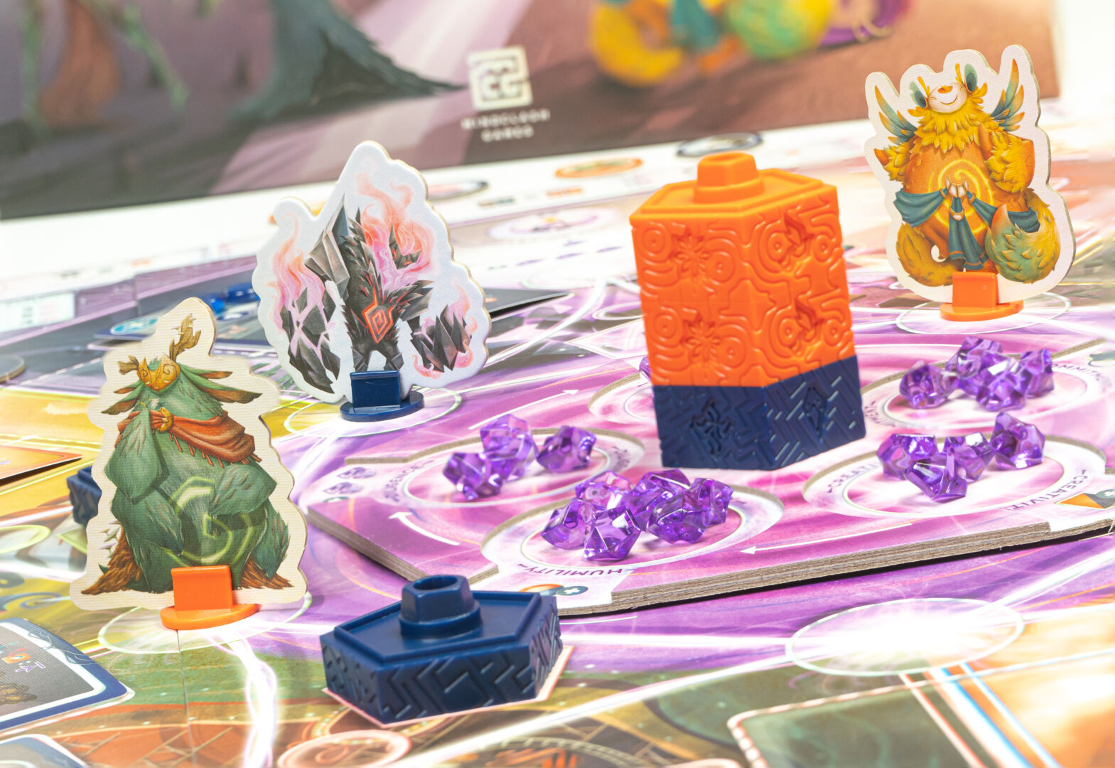 On their turn, players can take up to three Actions with their Spirits. Each of these actions cost one action point and some amount of Willpower. Willpower can be gained in several ways but mainly from the Spheres of the ever-rotating Origin in the middle of the board. Taking Willpower from the Spheres lets players have control over mid-game scoring; managing Willpower, then, is critical to the Spirits’ success.