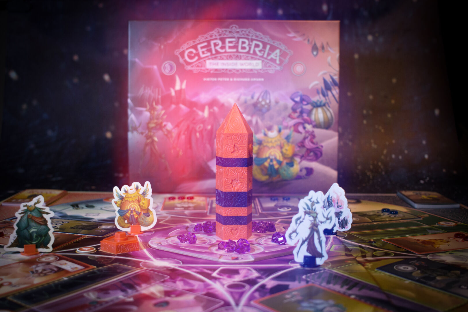 Cerebria – The Inside World is a wondrous and quirky world where players embody the Spirits of Bliss or Gloom, the two opposing sides of human nature. Competing to shape Cerebria’s Identity, Spirits spread their influence on the main board by invoking Emotion cards with various intensities and abilities; placing Fortresses to strengthen their presence in the Realms; unlocking upgrades to their Actions; absorbing Willpower from the ever-rotating Origin; and attempting to trigger Revelations at just the right time to score the completed objectives.