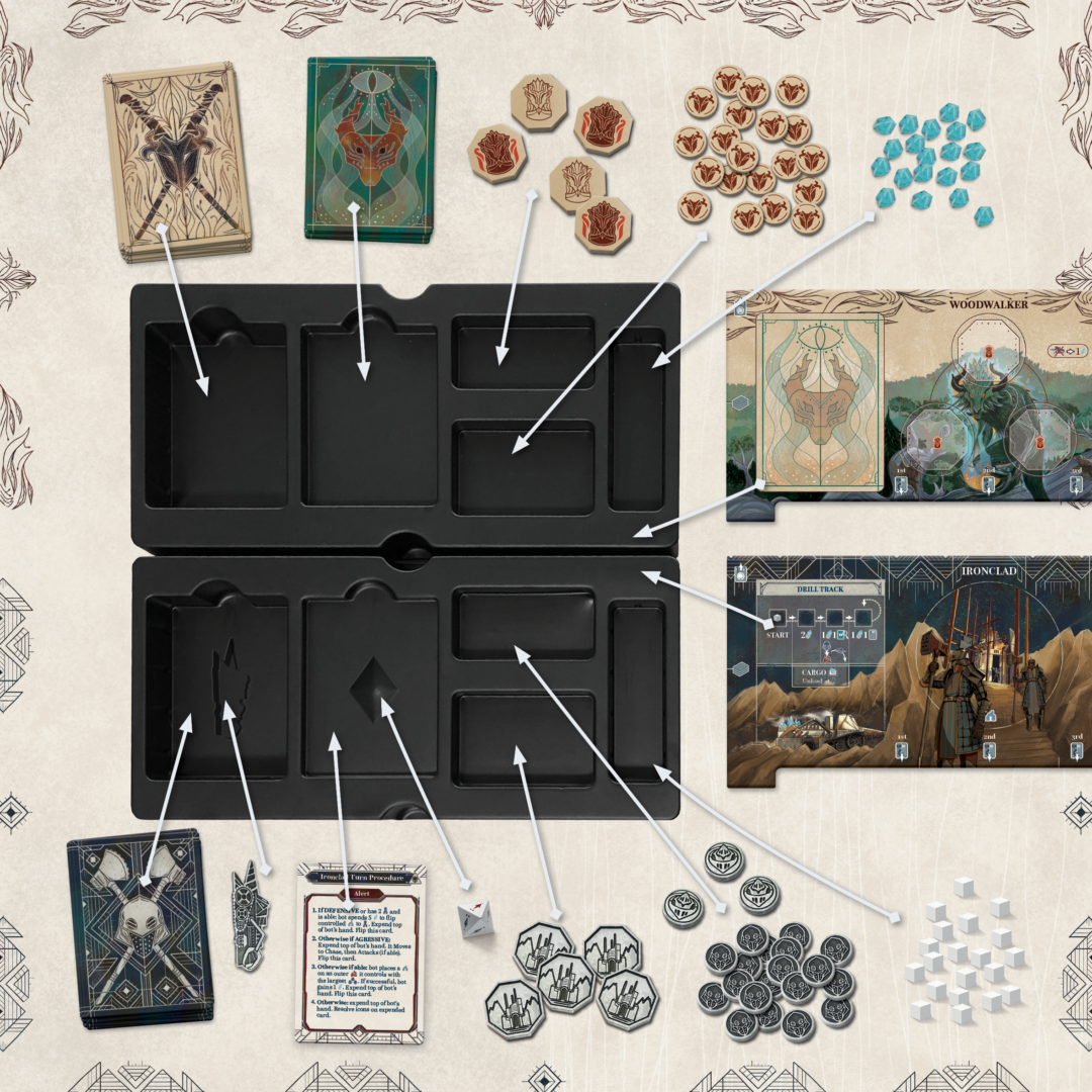 The Ironclad represent the established, defensive faction that prefers long-term development. The Woodwalkers have limited access to crystals, and as a result their more aggressive playstyle is focused on sabotage, looting and surprise attacks.
