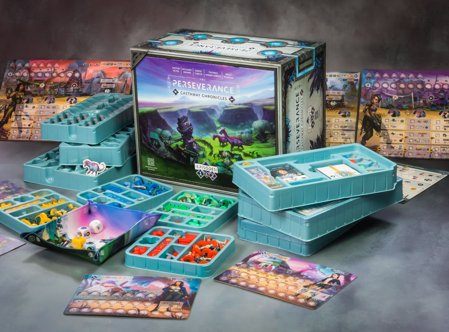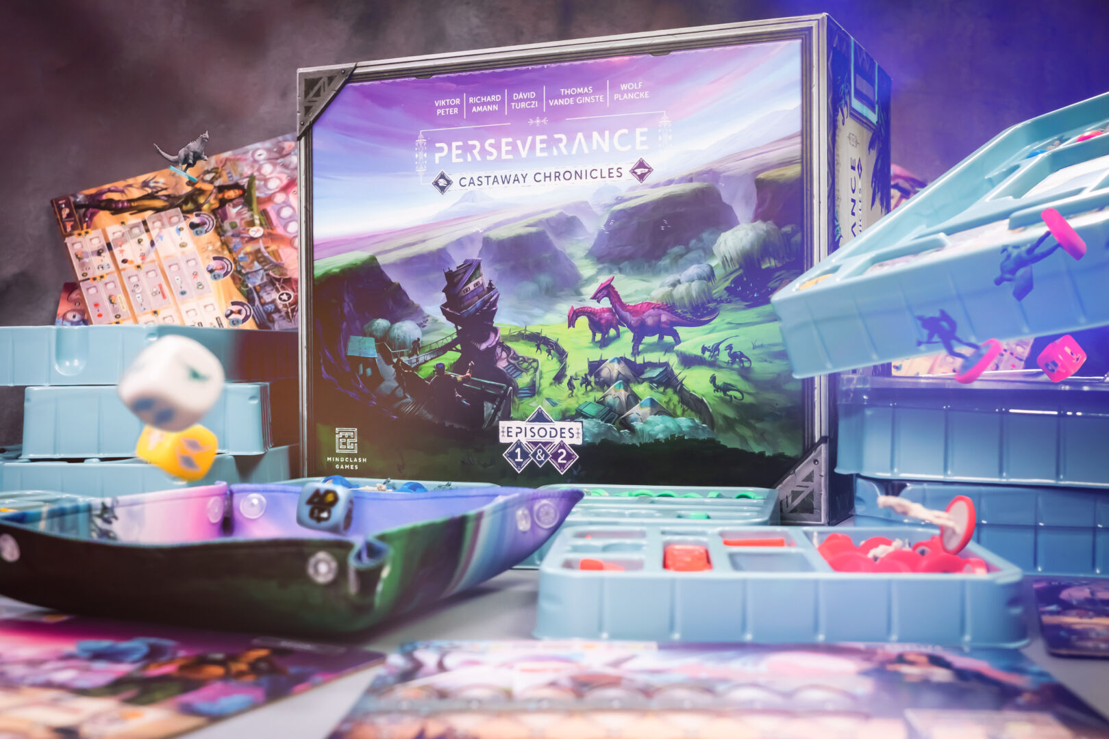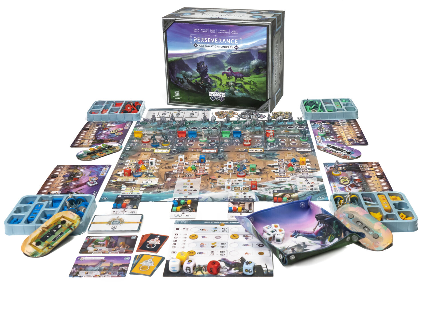 Perseverance: Castaway Chronicles introduces the first two episodes in a series of games. As each episode features unique characteristics and a different game feel, they are playable as standalone medium/heavy games but also as a continuous campaign, telling the story of a group of survivors building a strong society on a hostile island. The theme and story unfold through evolving game mechanisms across the episodes, also making the rules easier to learn. In the campaign mode, the outcome of each episode influences the next, but the game has no legacy elements and no hidden rules; the whole storyline is infinitely replayable.
