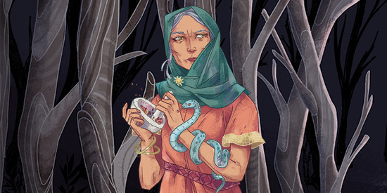 The short-sighted witch has long been susceptible to contact with the spirit world, and by studying crystals he has discovered that he can use them to her advantage without violence.