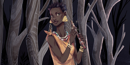 Music and rhythm give her a connection with the higher powers, helped by the fact that a travelling witch, seeing her talent, carved her a magical pipe that gave both solace to the suffering and inspiration to artists.