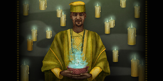 By using his powers to influence his father, Yoruba was able to reign in the Council's tyranny for months, but his actions were eventually discovered. Barely escaping an assassination attempt, he fled the country. After a long journey, he settled in Magoria, where he could put his mentalist skills to good use. Now, as much as he likes to amaze and entertain, his true goal is to gain enough fortune, fame, and influence to eventually return to his homeland and claim the throne that’s rightfully his.