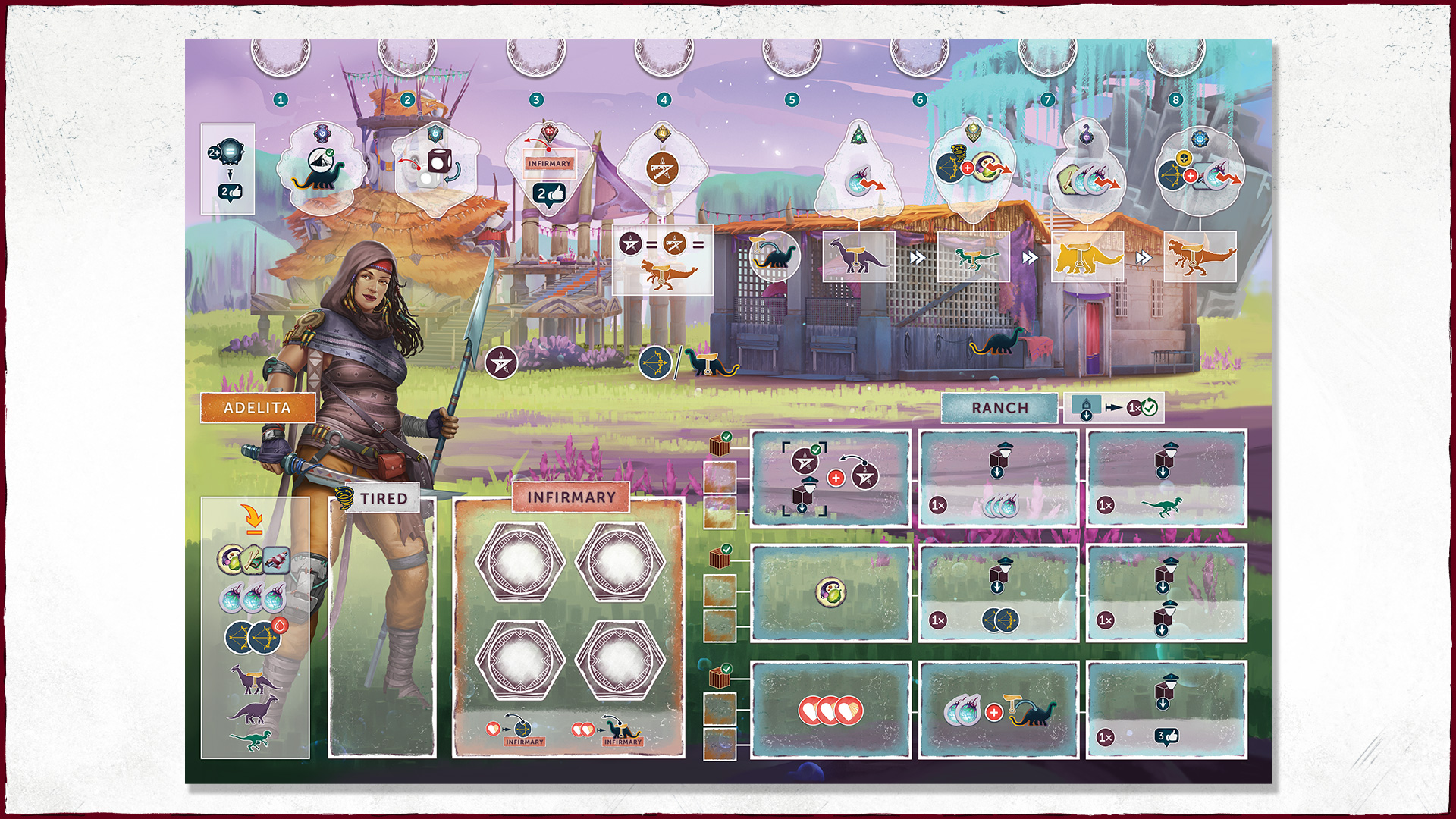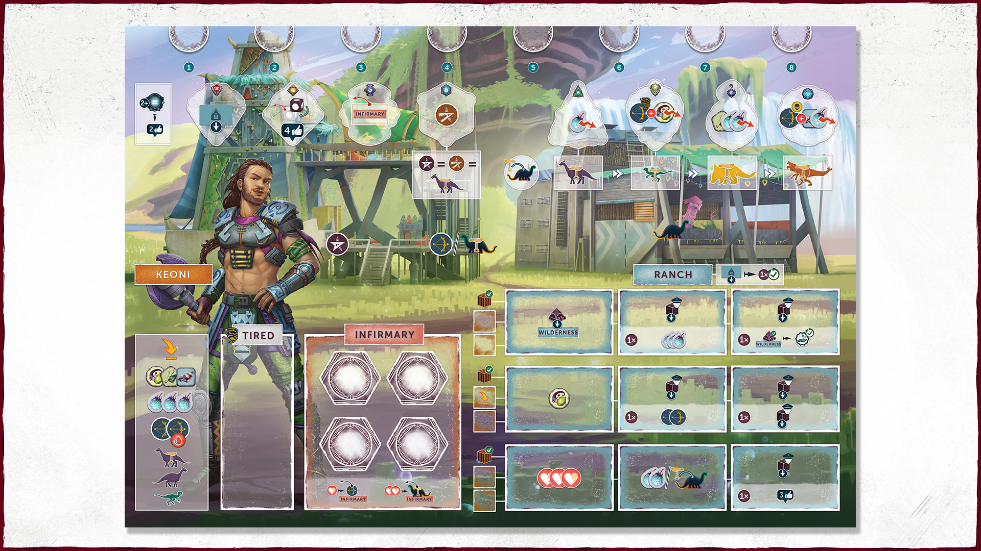 The new thing we can build during our primary action is a ranch tile – these are placed on our player board. Which leads us neatly into our secondary action options: while episode 2 had multiple secondary actions to deal with various aspects of the game, here we took a more unified approach – like the primary action – you have two options to choose from: you either activate one row of your ranch, spending the supply crates from it to activate one to three of the abilities printed next to it (either on the board, or on tiles you purchased to customise your ranch) – many of the preprinted options will allow you to place an influence on an officer. Which leads us to the second option: you can call in a favour from an officer, and remove an influence from them, to resolve their perk effect. You will find some familiar effects here: placing your leader in a city zone, starting an adventure, sending a Dino to the wilderness (effectively a second primary action), but new things appear here as building Landmarks: expensive constructions (you even have to contribute a Dino to the city’s communal crew) giving you strong player powers and/or endgame conditions.