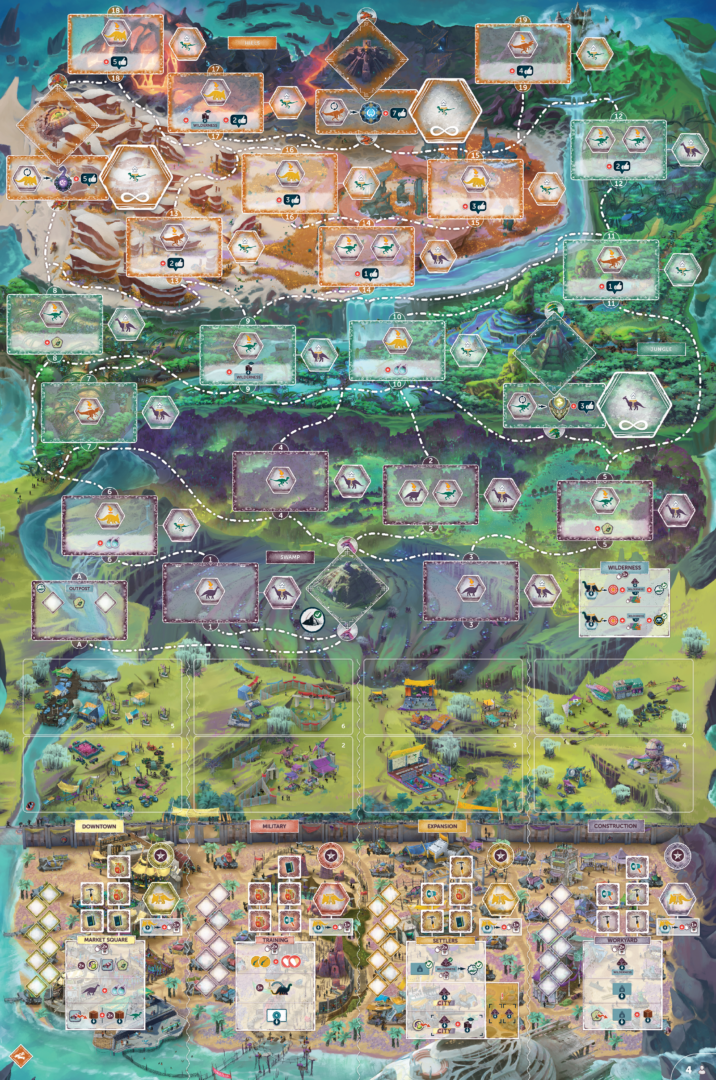 So now, each turn you have a choice: select a specialist – a die – from the pool and place it on a die space in the city, or take one of your tamed dinos and send it out to the wilderness to explore the island further than you would have ever made it on foot! Let’s look at these two options closer…