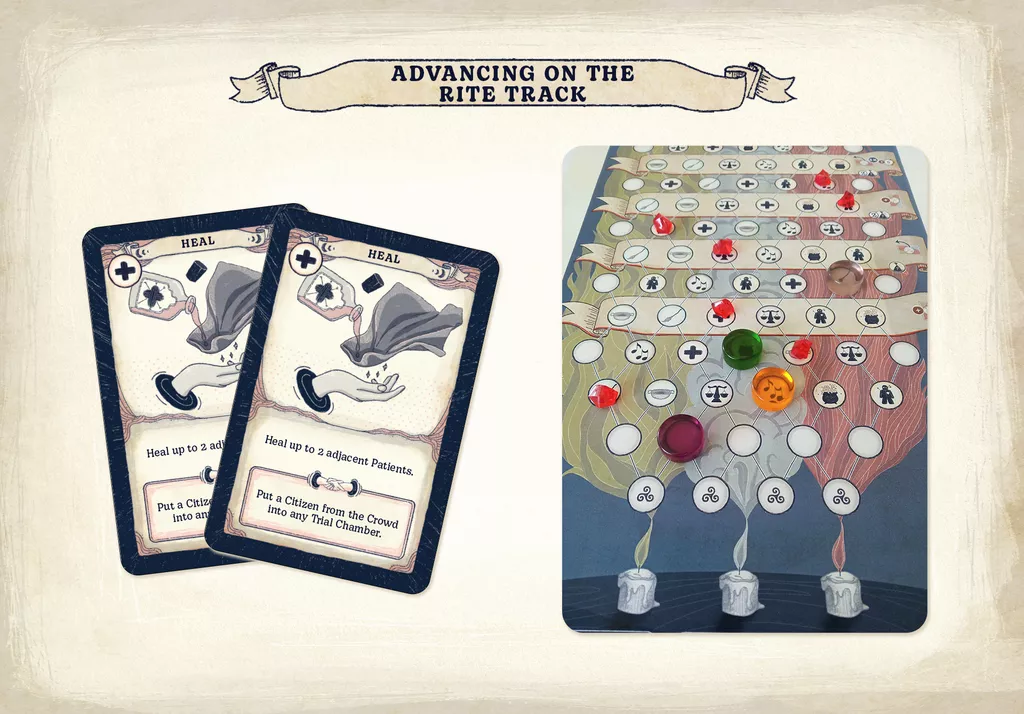 If you match with your action, you will draw a nearby Witch Hunter’s attention: your current Suspicion level and the result of a Hunter die roll together make the patrol range of the Hunter, and if you are within it, one of your Witches will be captured. Initially, with low Suspicion across the board and several empty Hideouts the map feels fairly safe, but with new Witch Hunters added almost every Season, just a few reckless matches can quickly get you into trouble.