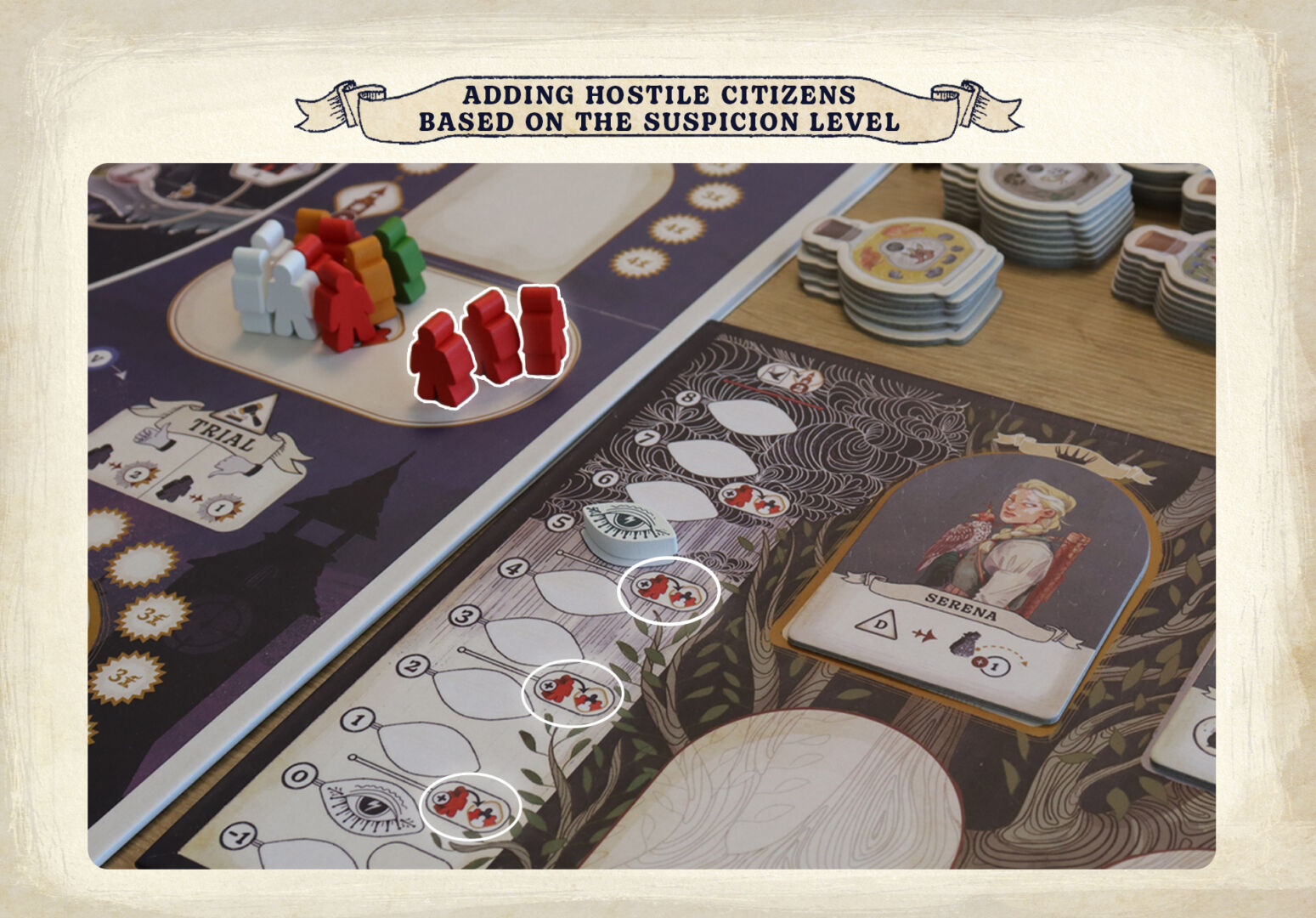 This is where the semi-coop vibes shine the most: on one hand, all players’ loyal citizens count towards outnumbering the hostile ones and winning the trial, but on the other, new hostile citizens are added to the Crowd before each trial based on the collective Suspicion level of all players – if everyone is playing recklessly, it will be pretty hard to win those trials. With that, we can keep the feeling that there are collective consequences of our actions without ruining the whole game with a common losing condition.