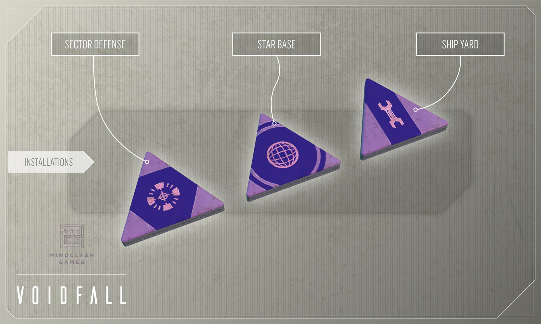 The other type of space in a sector are the triangular shaped ones. These are for your military Installations that you can deploy into the sector. They come in three types: