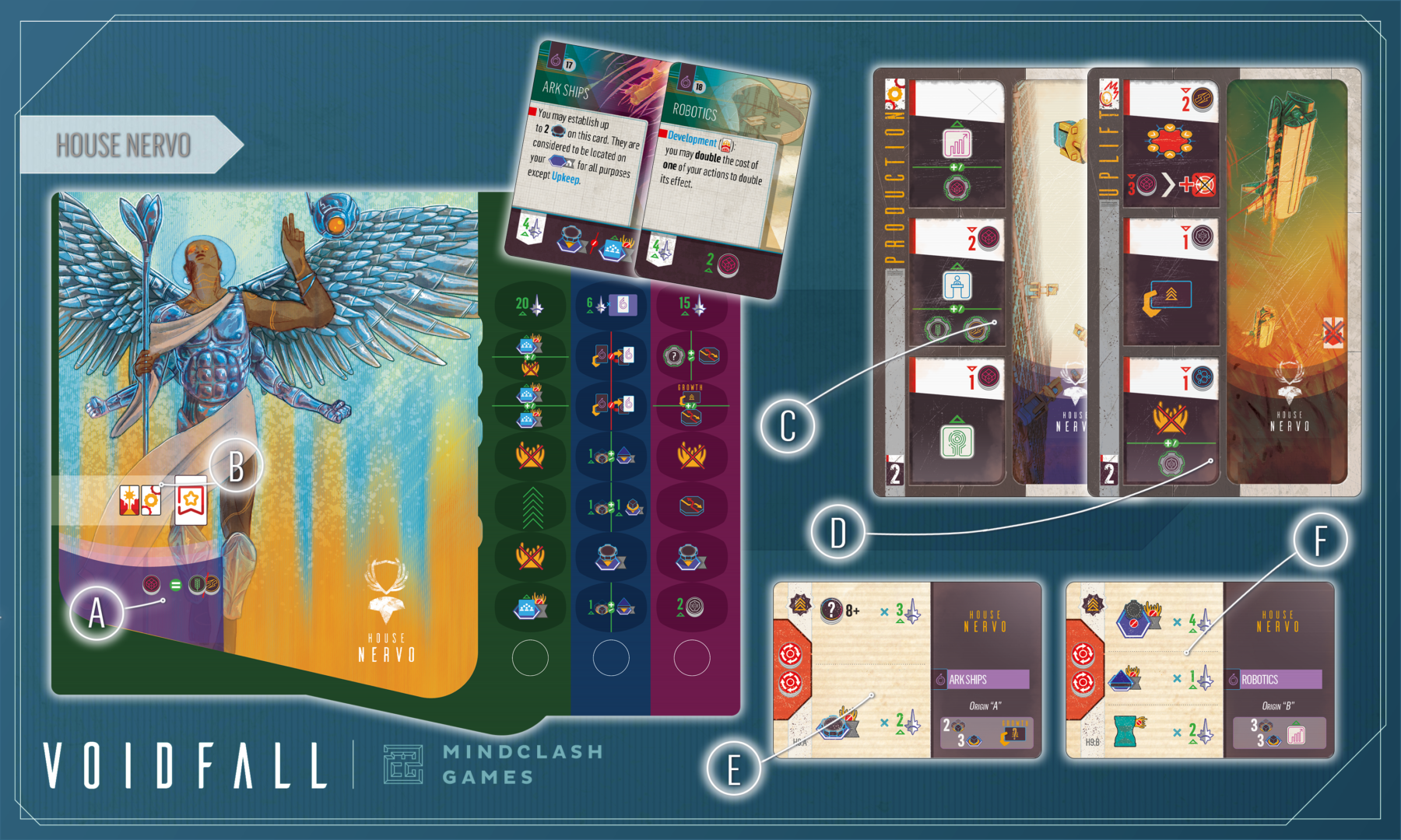 And House Nervo will have materials plenty: their custom Production Focus will allow you to cheaply produce Materials while advancing on your Economics track (D), and advance on one of the others using the other actions, possibly producing the rest of the resources. Why would you ever consider not producing the others? First of all, because Nervo’s special ability (A) allowing you to spend materials as food or energy during your actions (but not during Upkeep, similar to credits), and second because if you pick the third action of Production instead of the second, you can advance on your shortest Civilization track – Society, with plenty of Corruption management and Population increase – and a hefty influence bonus at the top.