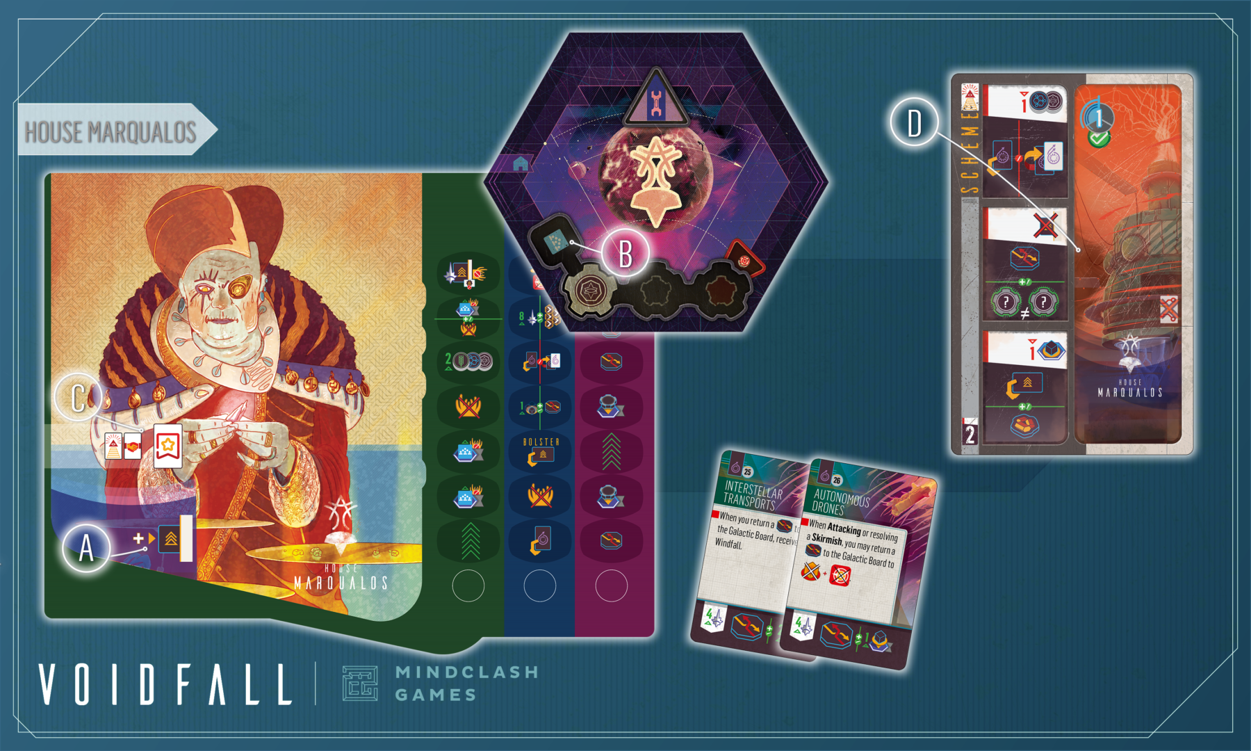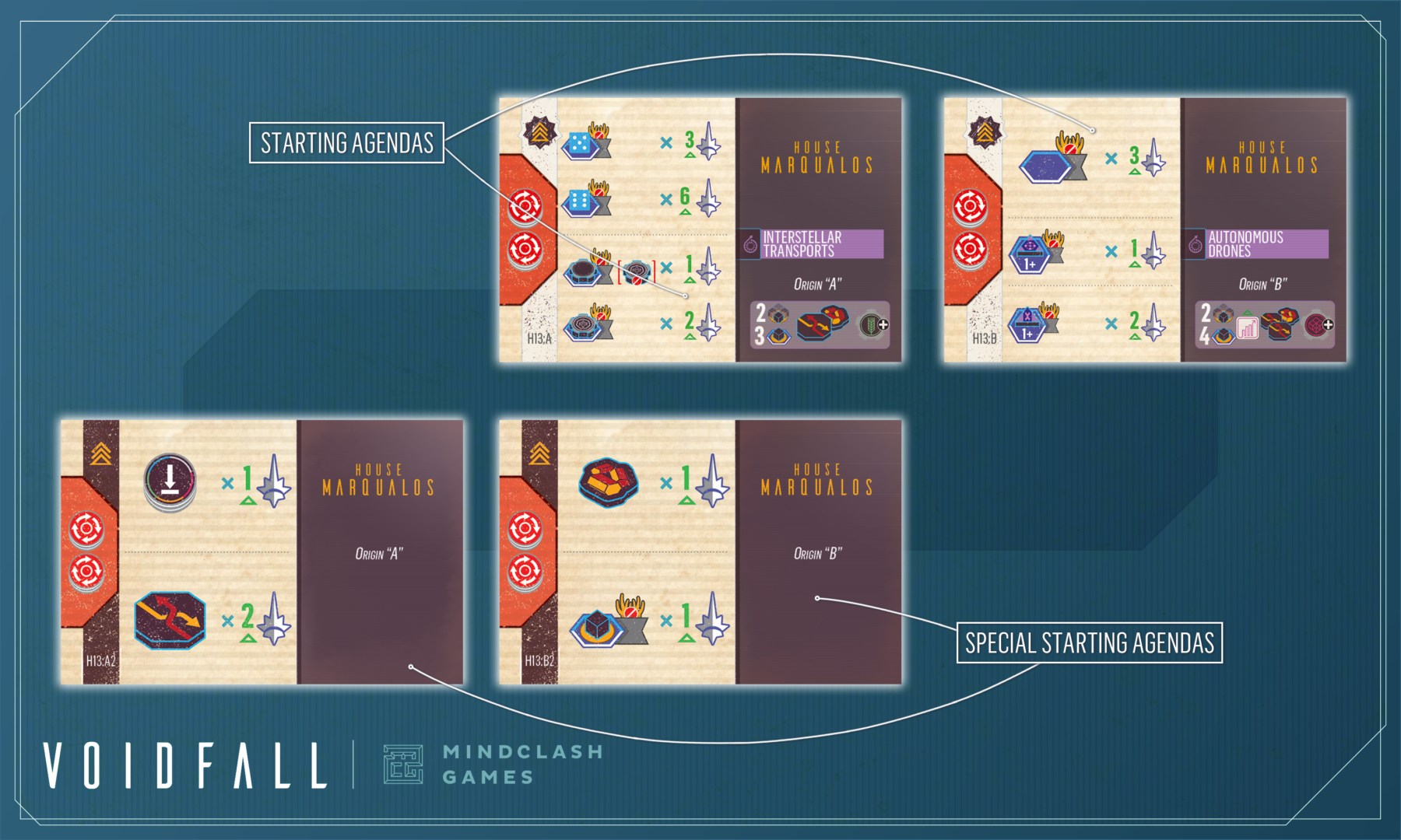 While its starting agendas are identical to the four starting houses’, Marqualos’ special power starts them with a second agenda already in play (A) – if you go for the usual “population and guilds” start of Interstellar Transports, your second agenda will require you to have balanced resources in your stockpile and keep some of your Trade Tokens, while if you try the “sectors and installations” start of Autonomous Drones, you will be collecting Bounty tokens and making sure to have a large Fleet Power presence on the board.