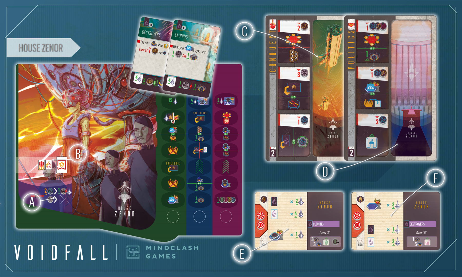 One of the two most aggressive houses (besides House Yarvek), Zenor is built around exploitation of science and the civilization tracks. Whenever they have excess science, for every second excess science (A) they gain 1 credit or 1 influence (beyond the normal 1 or 3 influence players gain for excess). This means that as long as their science setup is strong – and there is no reason not to make it so, especially considering the top of the Statecraft and Economics tracks, they have no resource to worry about besides some upkeep. The only downside in return is that they cannot gain influence for excess credits, but that is not a common consideration anyway.