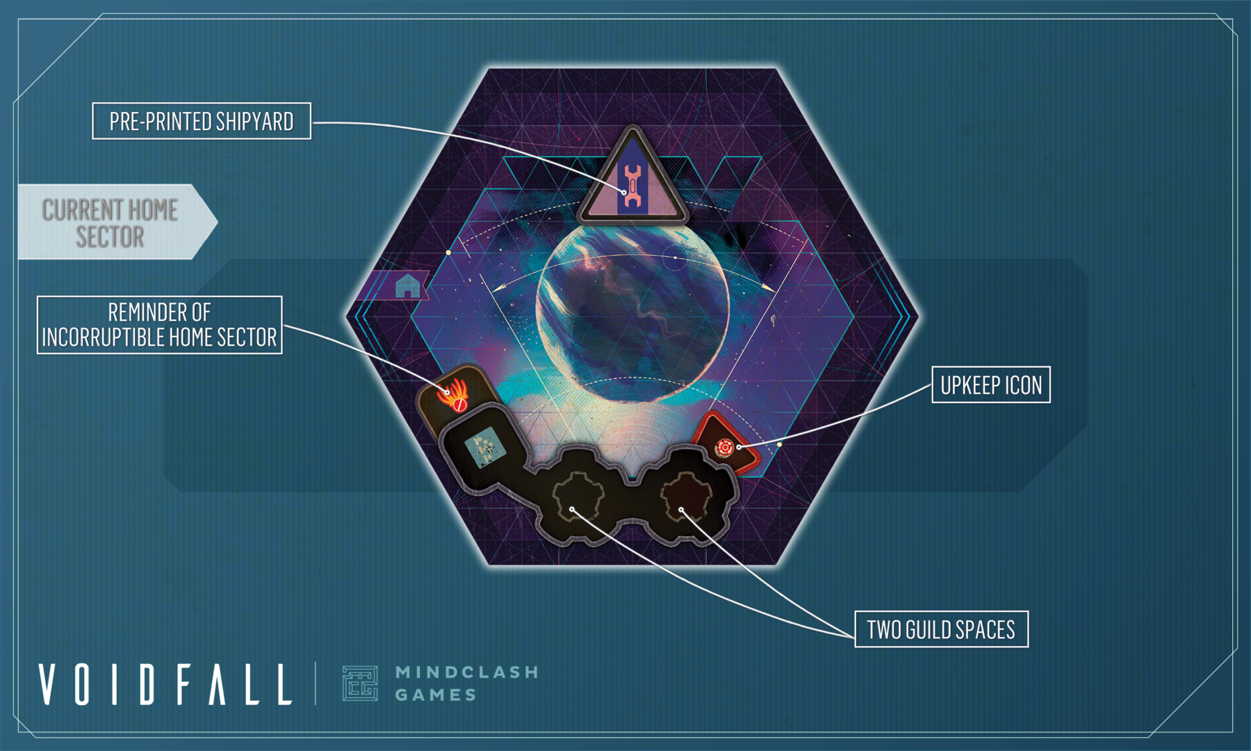 🌠 We reduced the number of guild spaces on the home sector to two, with the upkeep triggering on the second. Since the starting four houses all start with 3 guilds, we updated their origin cards, to place two of them into their outpost sector instead of their home sector. This created a perfect setup: players could build up to two more guilds before expanding, but each of these guilds added a new upkeep.
