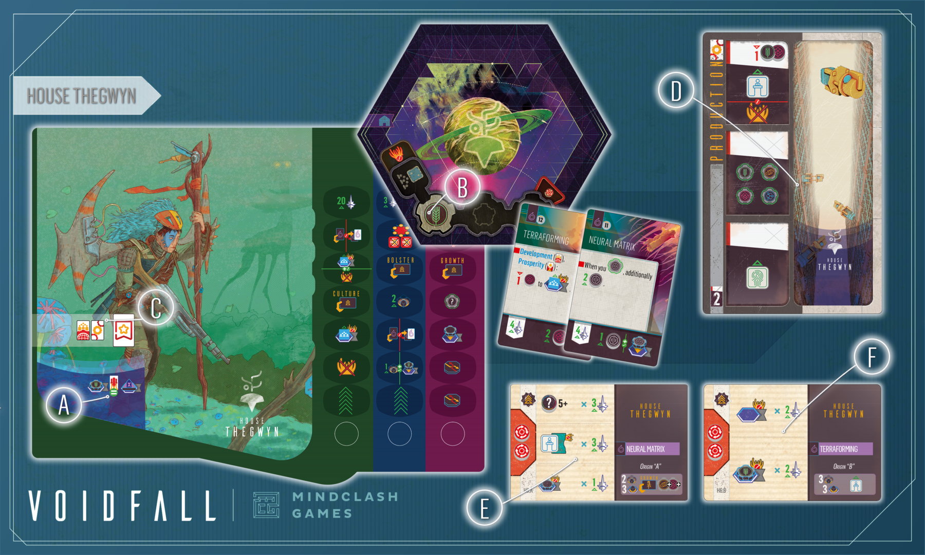 House Thegwyn is all about the Farmers’ Guilds. Genetically engineered organisms, fighting their battles: parts of their ships are grown, not assembled. This is represented by their house ability: they count Farmers’ Guilds as Shipyards during Reinforcement Focus (A). So naturally, they don’t need a Shipyard in their home sector, instead they prefer to use the natural resources of their biosphere, as represented by the pre-printed Farmer’s guild on their home sector (B). Developing and harnessing their environment is their life bread, as further reinforced by their Preferred Focuses being Development and Production (C). But their production is not any ordinary production: due to their organic computers and neural computing, they can produce Science at the same time as the three supplies, and they prefer more deliberation instead of hastily whizzing across the sectors. Shown by the fact that they are missing a Regroup from the same Focus card – instead they choose to forgo the Corruption remove effect and advance on their powerful Statecraft track instead (D). Their two Origins specialize either using their organic networks to create a powerful Neural Matrix, to rival the banking networks of houses Belitan and Marqualos, or using their biochemistry expertise to deploy Terraforming gasses to enrich their sectors.