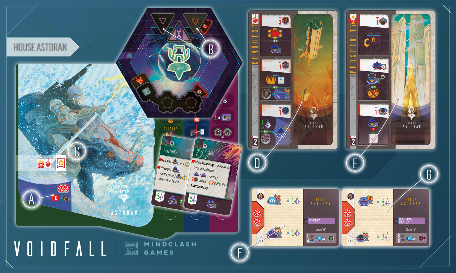 We could not miss having their ice-planet present in the game, so naturally, House Astoran gets a custom starting sector as well. Quite similar to the regular sector, except because Astoran loves its big missiles so much, you are allowed to construct up to two more installations at home (B). And naturally, for someone who likes to build so much and focus on warfare, Development and Conquest are their two Preferred Focuses (C) – and what a Conquest card that is! Uniquely amongst all invading effects in the game, Astoran’s Conquest allows them to immediately build an installation before or after Invading (D)!