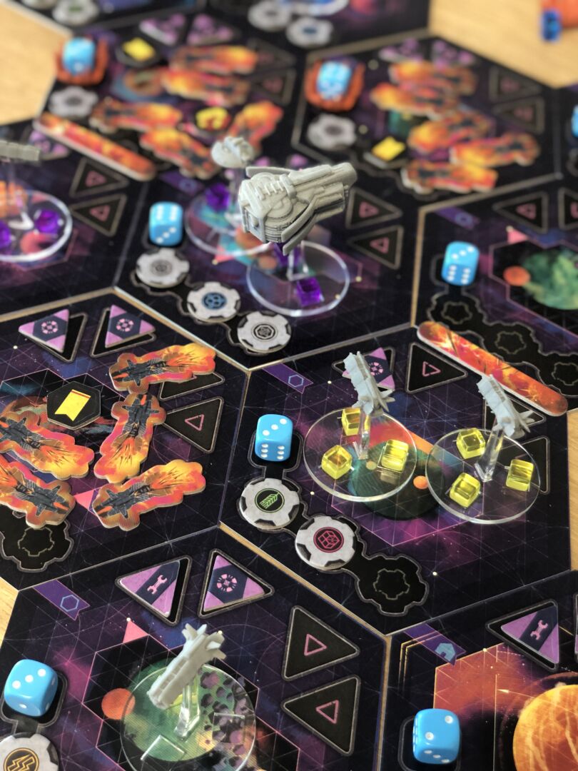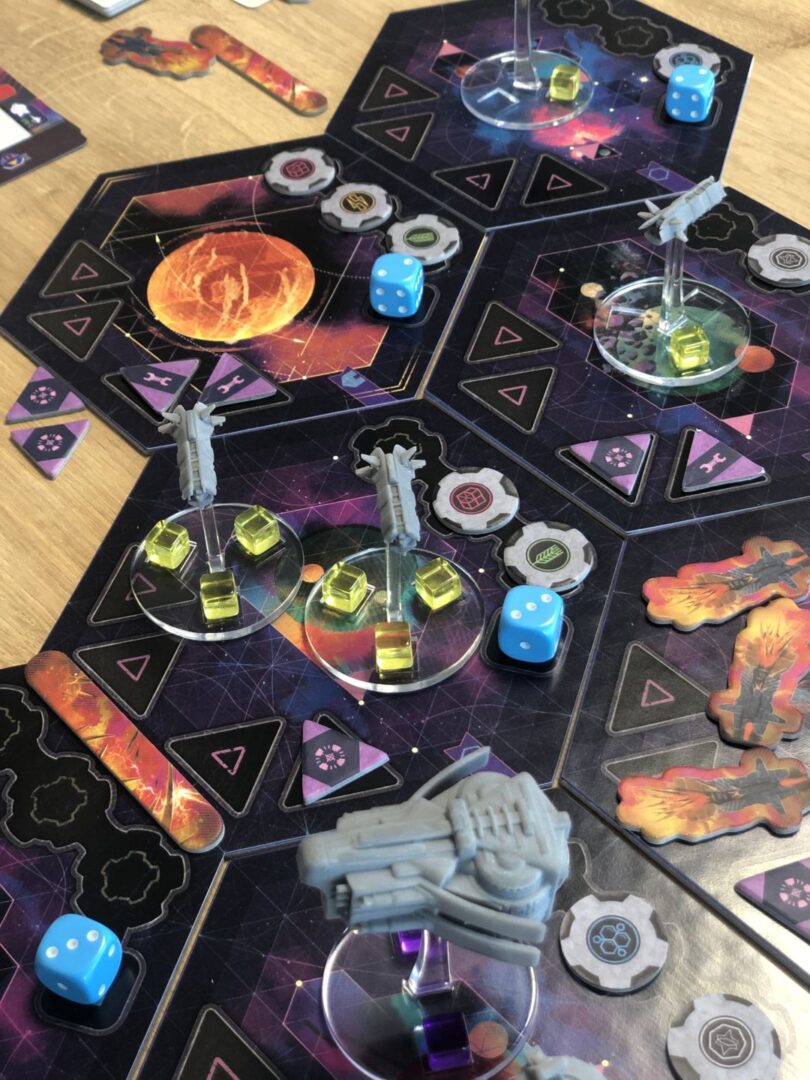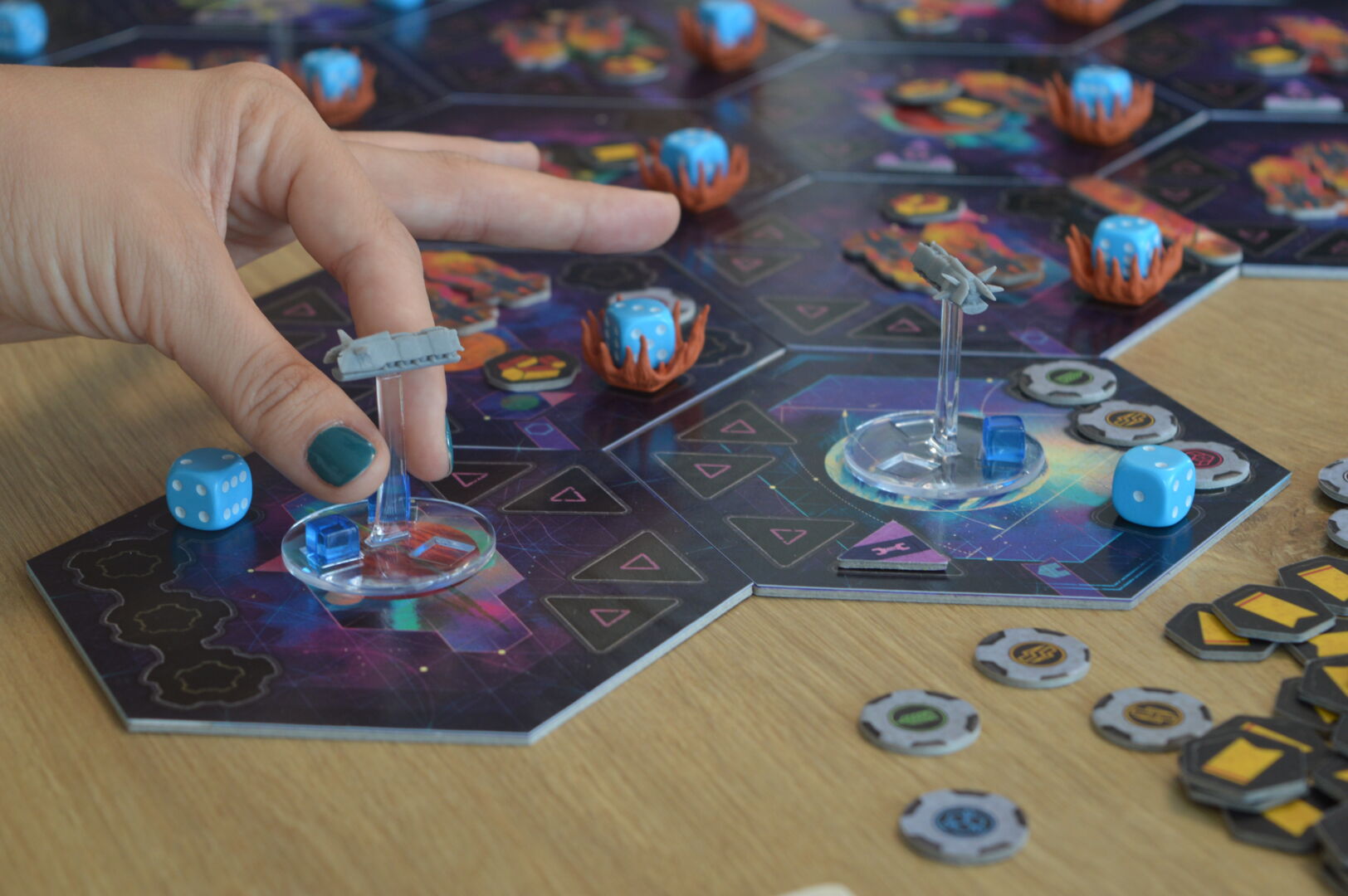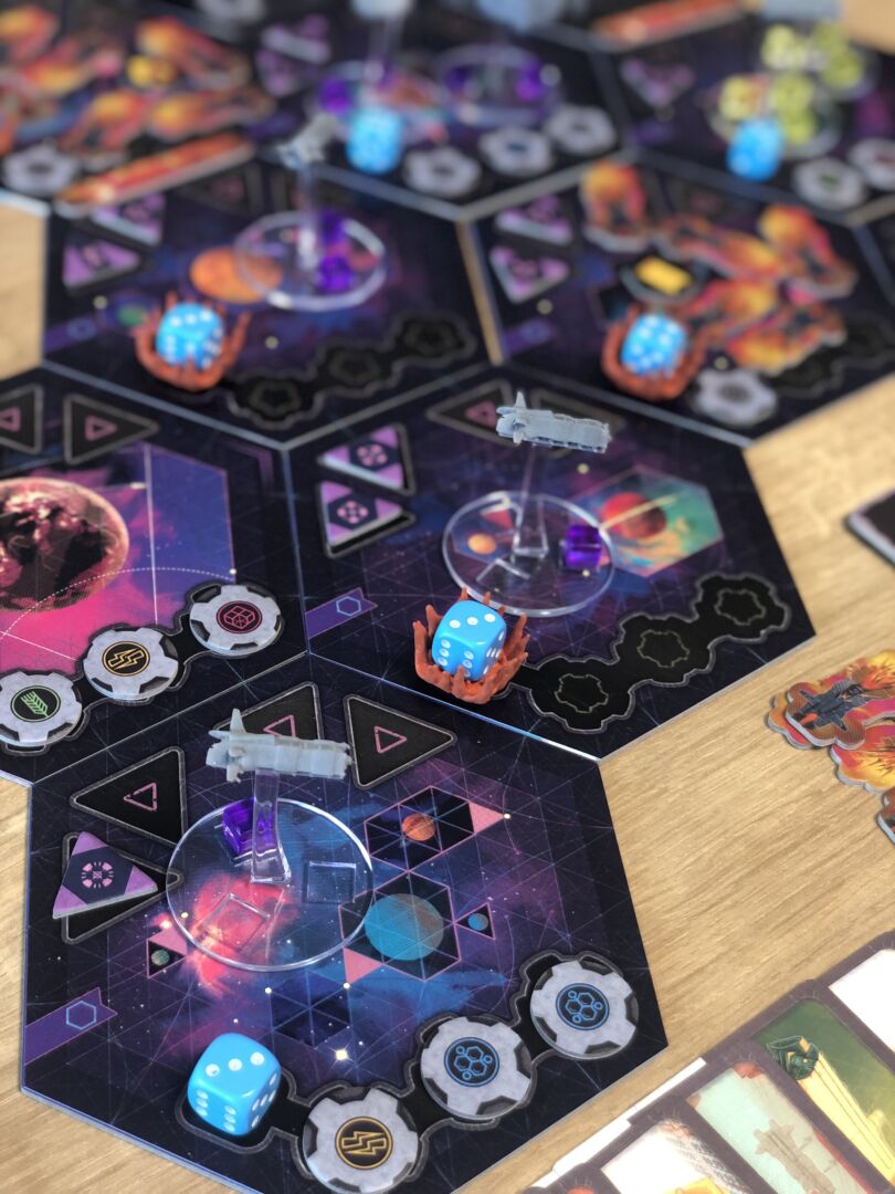 Before we jump in, we wanted to say a huge thanks again for your enthusiasm, comments and questions under these weekly design spotlights – they have helped us to prepare for the Kickstarter and finetune the game a lot during these last few weeks! One of the most important features you commented on after the first entry was the color scheme and UI on the hexes, which we’ve been discussing with Ian O’Toole since the launch of these weekly posts. It’s quite difficult to judge the usability and color of such an integral part of the game without having seen it in real life, so we actually decided to wait for the prototypes to get here with the purple color scheme and UI so we could test it. It was a very valuable and satisfying experience because it proved two things – after countless digital playtests, the game works wonderfully with real-life components (*phew*), and the table presence is amazing. Nonetheless, your comments about the hexes stuck, so we decided that it was worth dedicating a bit more time to them in order to make the map feel more galaxy-like and strengthen the 4X feel. So, Ian O’Toole created these new hex designs for Voidfall, which we believe are more on brand with the game! They were also tried and tested in reality and they work just as well, if not better than the previous version.
